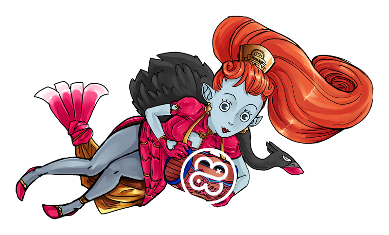 Bild von einer Zauberspruchverkäuferin mit roter Haut und blondem Haar.